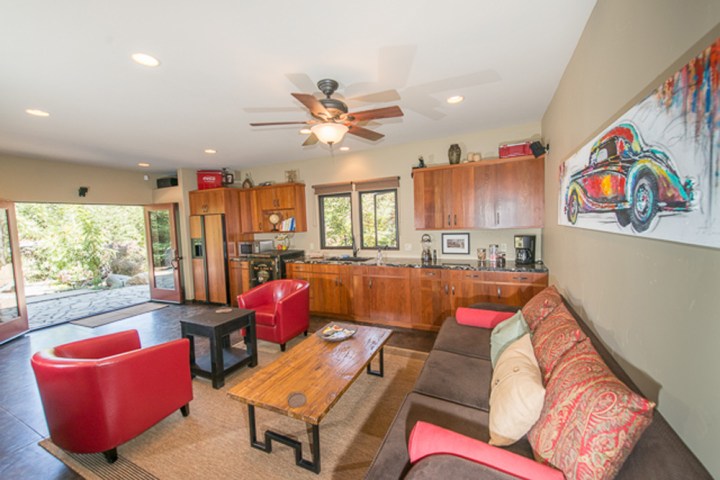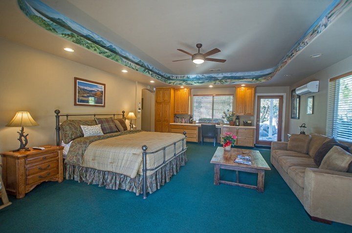 The beautiful, newly appointed suites include fresh fruit, organic toiletries, luxurious California king bedding, a large sitting area, Wi-Fi, television, AC, and kitchenette. The suites are stocked with literature about Sequoia National Park, games, and  a library of book and magazines about the area. Each of the two suites has a private patio with bbq. Each suite accommodates two. The rooms are non-smoking and no pets.